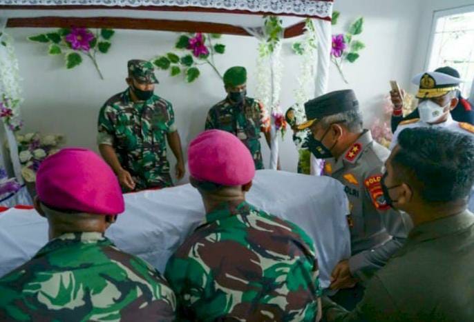 Saat tiba di rumah duka, Kapolda NTT Irjen Pol. Drs. Setyo Budiyanto, juga ikut bersama anggota TNI mengusung peti jenazah Pratu Marinir Wilson Anderson Here.