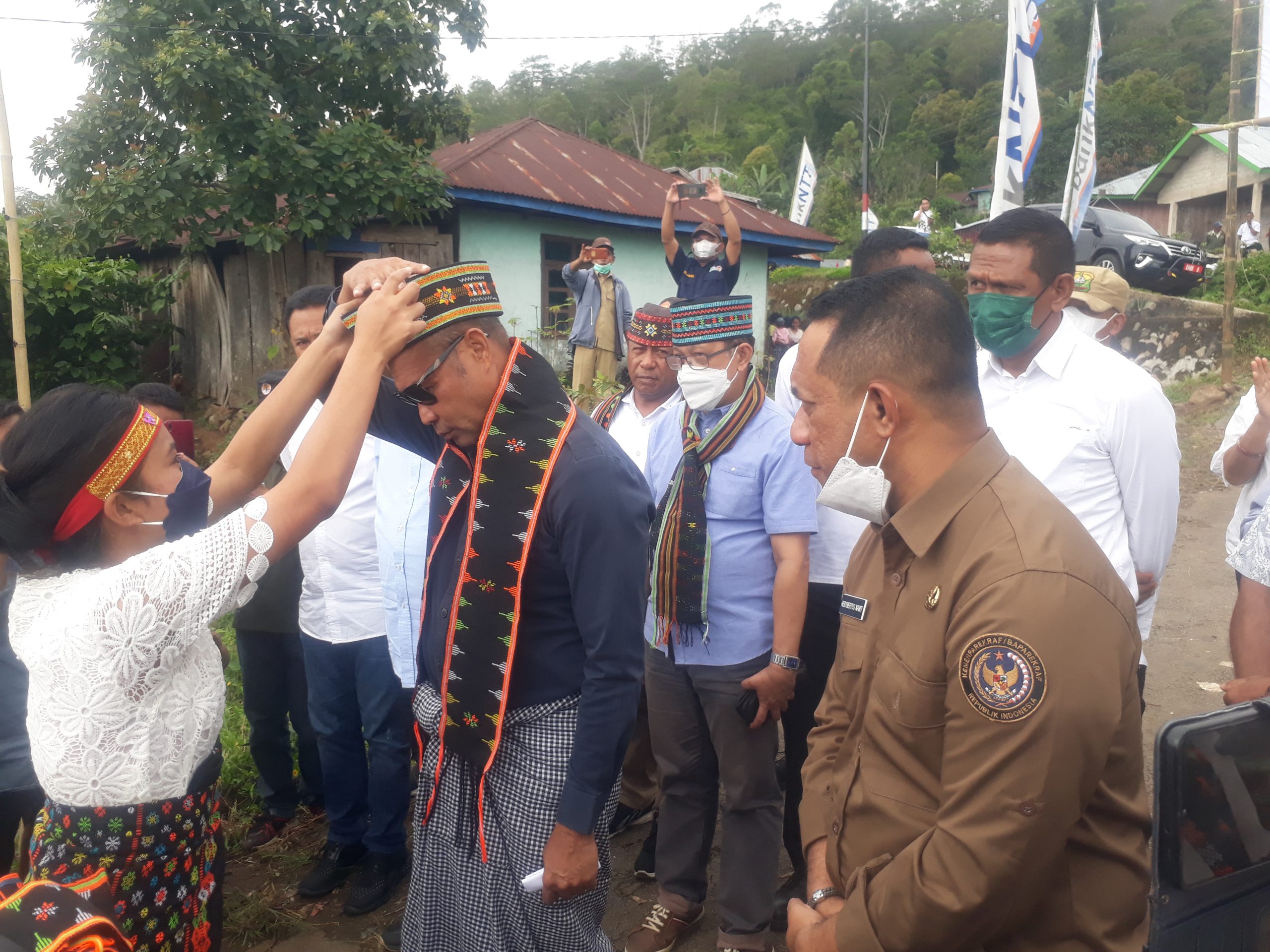 Setelah pengalungan selendang dan pemakaian songko, Gubernur dan rombongan kemudian diarak oleh sejumlah toko adat menuju rumah adat kampung Wela.