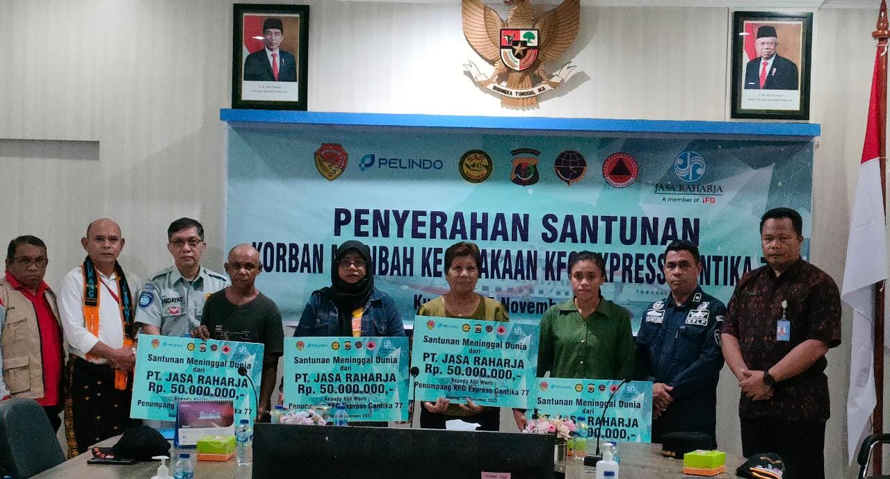 KUPANG, PENATIMOR – PT Jasa Raharja Cabang NTT kembali menyerahkan santunan kepada lima ahli waris korban hilang pada musibah kecelakaan Kapal Cepat Express Cantika 77.