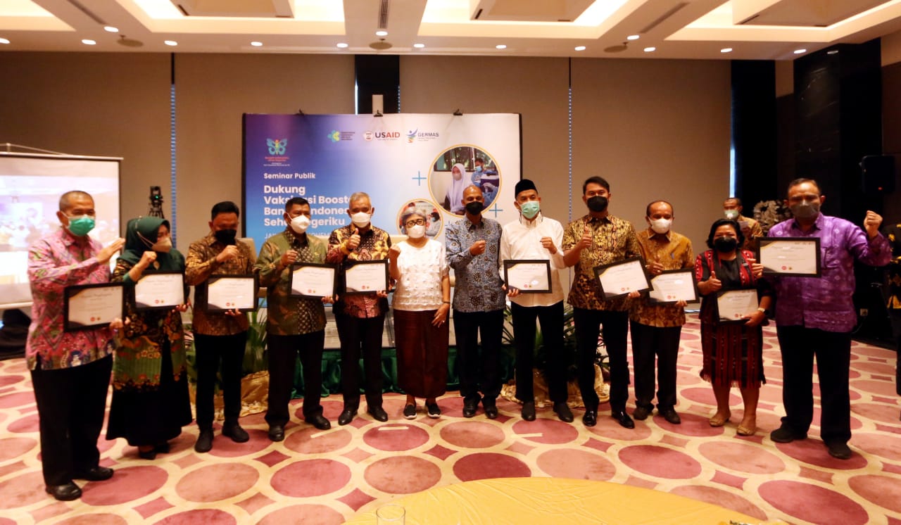 Dalam acara seminar publik ini, USAID didampingi JHCPP juga turut memberikan penghargaan kepada 10 Kepala Daerah yang berasal dari daerah fokus kegiatan program Breakthrough ACTION for COVID-19 atas upaya percepatan peningkatan vaksinasi COVID-19 melalui Program USAID Breakthrough ACTION for COVID-19.