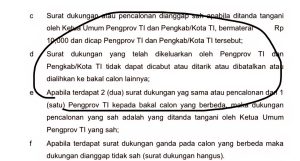 “Apabila terdapat 2 (dua) surat dukungan yang sama atau pencalonan dari 1 (satu) Pengprov TI/Pengkab/Pengkot TI kepada bakal calon yang berbeda, maka dukungan pencalonan yang sah adalah yang ditandatangani oleh Ketua Umum Pengprov TI/Ketua Pengkab/Pengkot TI yang sah.”